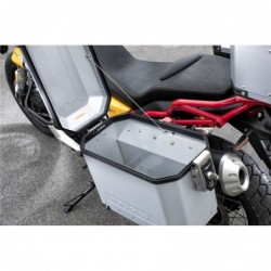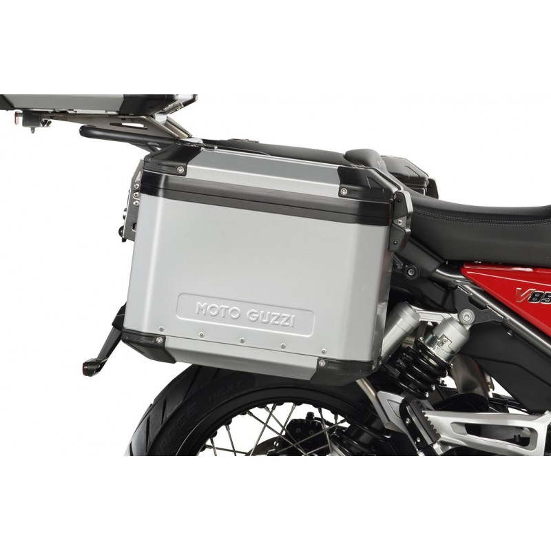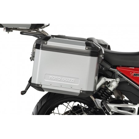 Maletas fabricadas en aluminio de 1,5mm de espesor, ultrarresistentes y espaciosas (IZQUIERDA 33LTS, DERECHA 38LTS), están pintadas con pintura en polvo para ofrecer la máxima protección y durabilidad. Están asegurados al vehículo mediante un sistema de cerradura con una llave de seguridad especial y se pueden quitar fácilmente en unos segundos. Se suministran cerraduras adicionales para que solo se pueda utilizar una llave para maletas laterales y la caja superior 48 LT. La apertura desde arriba facilita la carga. Las bolsas internas se venden por separado. 100% fabricado en Italia. Se necesita soporte para maletas laterales 2S001342.