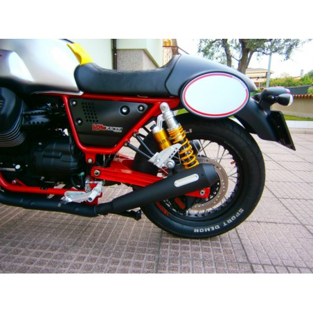 Silenciosos MISTRAL cónicos cortos HOMOLOGADOS para V7 III Racer E4, en acero inoxidable y acabado satinado o negro, inspirados en los sencillos diseños café racer de los años 70-80.
