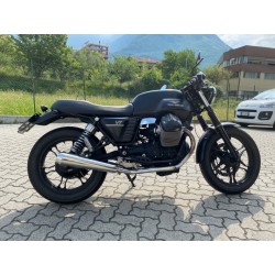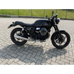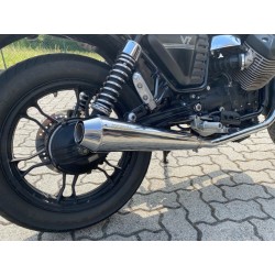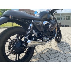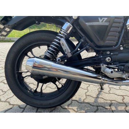 Silenciosos MISTRAL cónicos cortos HOMOLOGADOS, válidos para V7 II Stone/Special y V7 Classic/Stone/Special; en acero inoxidable y acabado pulido, satinado o negro; inspirados en los sencillos diseños café racer de los años 70-80.